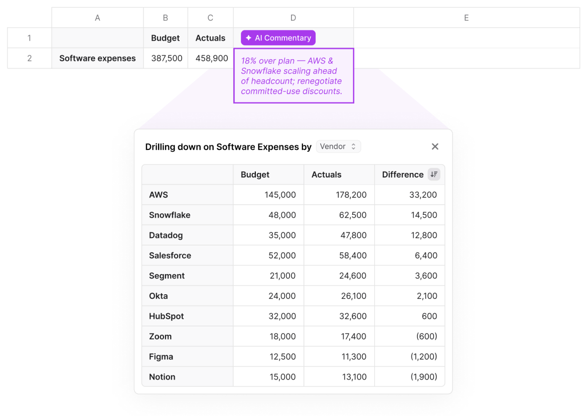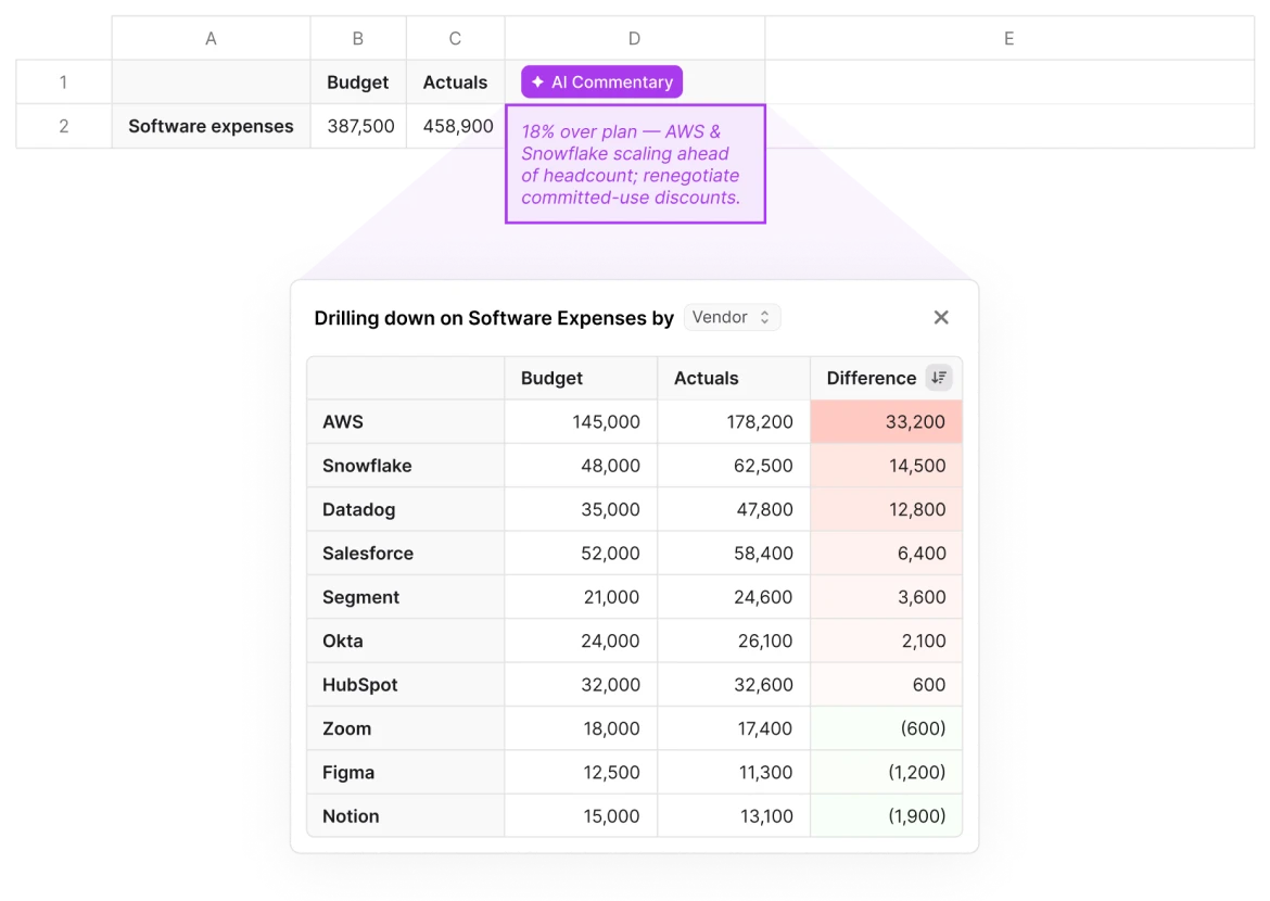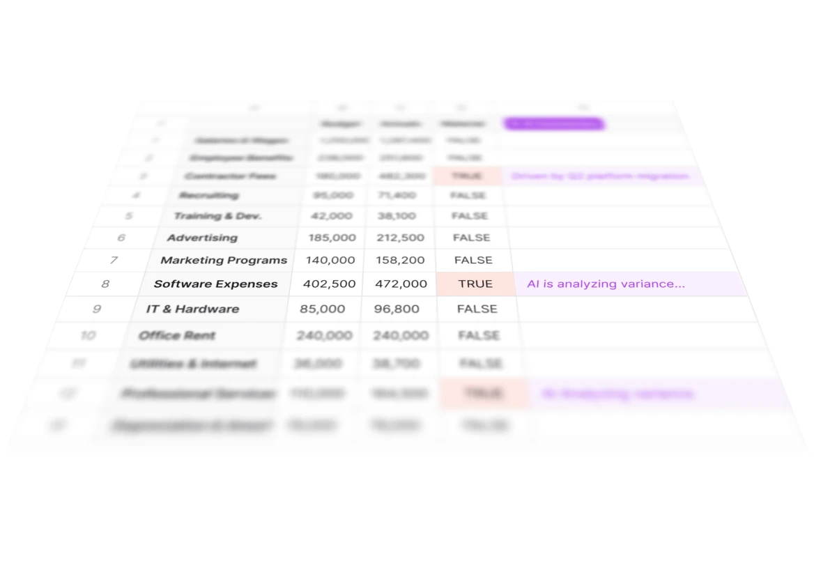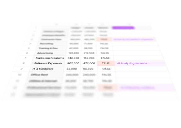 to begin with, this is just like a normal LF Explorer. So if you look into it, what I'm doing here is I'm just bringing by account, by month, for a few months, my financials, and I'm adding here these calculated items of the difference and difference percent. If I pull this, it's, you know, normal non AI left functionality. And then the what you can do with this new feature is add like an AI variance analysis to it. So if I come here and I select pull and scan, I can choose my threshold for what's material, and I can give it a go. This will pull date again. It will signal which are the columns that have material differences based on our threshold. So here you see, we have, like, five or seven. And from there, it's gonna go one by one. And what's it doing in the background, and this takes, you know, between forty five seconds and a minute, is is taking each of these. So let's say legal services, it's doing a drill down by different, dimensions. So it's coming and saying, okay. I'm gonna do it by department. I'm gonna do it by class. And then it's aggregating all of that up. So one of the things that they do in background is something like this, where you see we have quite a bit of vendor level detail. And now we finish, and you can see if I choose that same sample, it's a very simple one. The overall difference is one seven point three, and then there was one vendor, particularly, Lee and Associates that explains most of the difference, and that's what the AI surfaced. The idea is that not only the AI surfaces this, but also it's very easy to check its work. So if you select and you try to do the same drill down again, it will automatically suggest that vendor name is the dimension that would make this interesting. Two other things to highlight. So this works with other you know, every other, dimension. Here you see that we're doing it by location. But the the two things that are, interesting to highlight on top of that is, one is this one, that if the AI doesn't find something interesting, it won't hallucinate. It will just tell you, I couldn't find anything interesting. The other thing that is, worth highlighting is in a case like this one where we have events and retreats. If I do many, many drill downs, nothing will be interesting. And the best one will be transaction memo. But if I do the transaction memo drill down, that is the one that the AI is going to suggest in this case. I will also see that there's a lot of transaction level detail that is not very structured. But I do see that if I can go and filter, I will see certain themes, and I will see that there's a lot of expenses, roughly thirty nine k, that are tagged with retreat. And that is what the AI did. It says that if I'm grouping, if I'm going to all of these detail and saying there's a lot of these are retreat, I see that there's thirty seven k, from thirty two lines related to retreats. So you don't necessarily need the perfect data for this to make sense. You can also take advantage of the idea of AI doing that cleaning and that grouping for you on the flight.
