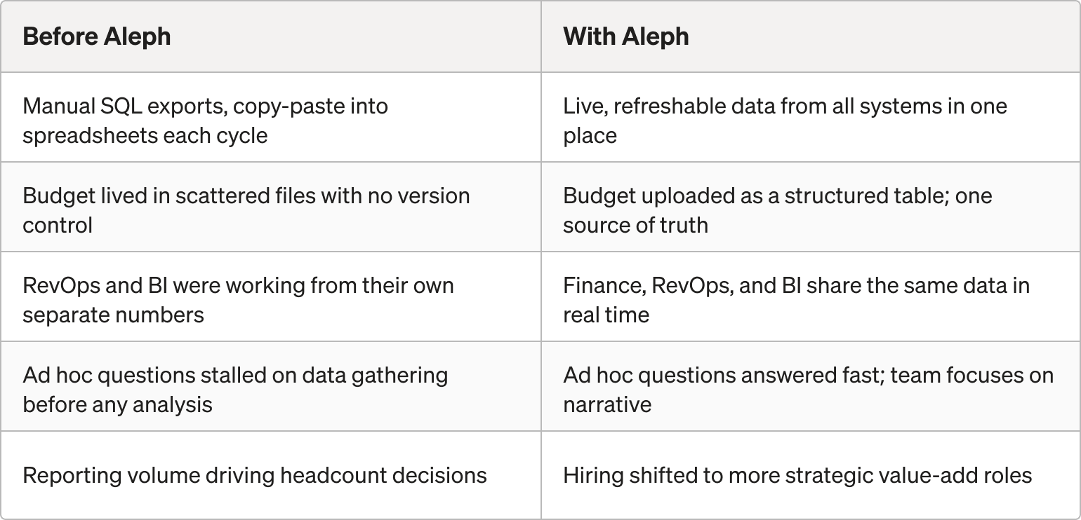 Over four years, Aleph has grown alongside Postscript's finance function. What started as a reporting tool expanded to cover budgeting and scenario modeling — and then expanded again cross-functionally, becoming the connective layer between finance, RevOps, and the BI team.